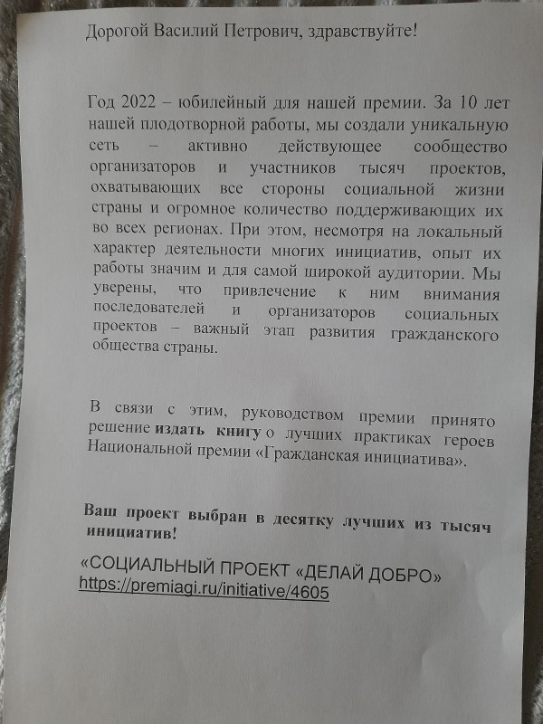 В 2022 году 10- летний юбилей Национальной премии "Гражданская инициатива", в связи с этим руководство премии приняло решение издать книгу о лучших практиках героев Национальной премии "Гражданская инициатива". Социальный проект «Делай добро» В.П. Найденко выбран в десятку лучших из тысяч инициатив, тем самым поднял свою Нижегородскую область на высший пьедестал в Москве.