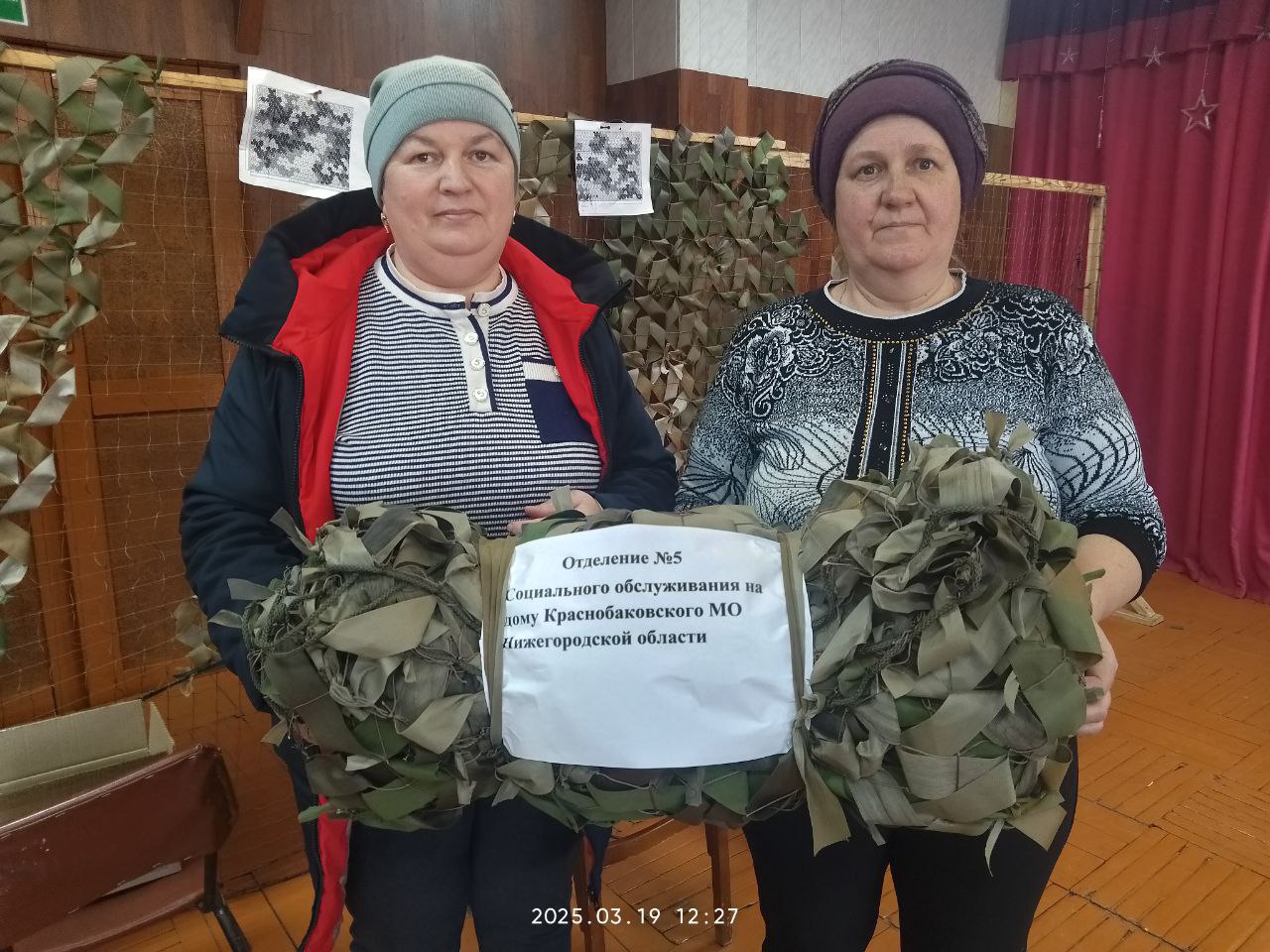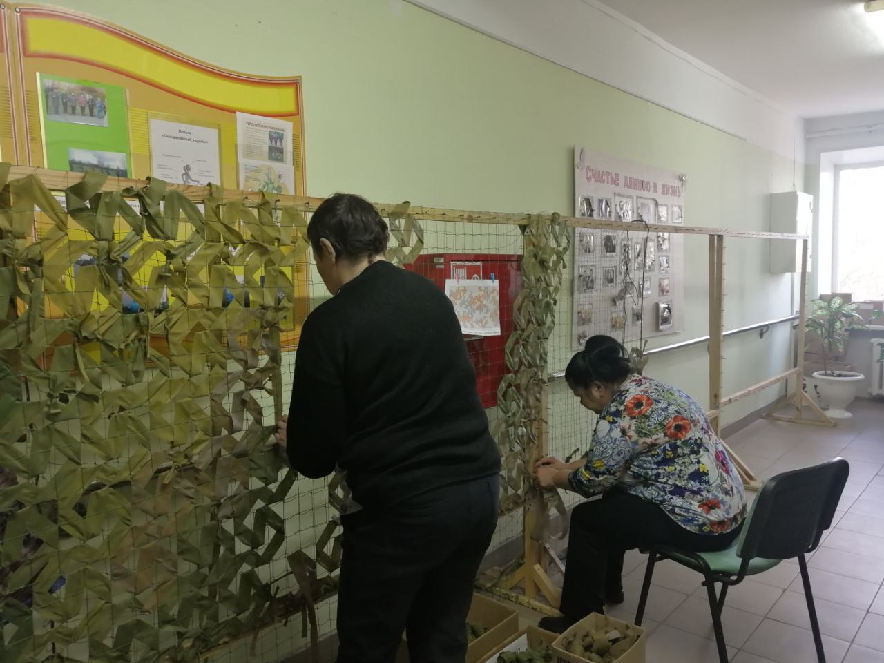 Социальные работники и специалисты ГБУ "КЦСОН Краснобаковского муниципального округа" изготовили ещё несколько маскировочных сетей для СВО. Приступили к плетению следующих сетей.
