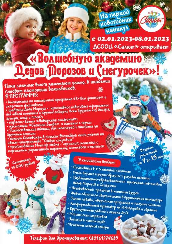 На период новогодних каникул с 02.01.2023 по 08.01.2023 года ДСООЦ "Салют" открывает смену "Волшебная академия Дедов Морозов и Снегурочек". Телефон для справок и бронирования: 8-831-61-2-76-89.