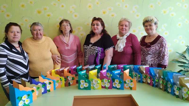 На занятиях по трудотерапии под руководством Моисеевой Н.Н. обслуживаемые Отделения дневного пребывания изготовили поздравительные открытки "С днем семьи" для семейных пар, обслуживаемых в отделениях социально-бытового обслуживания на дому.