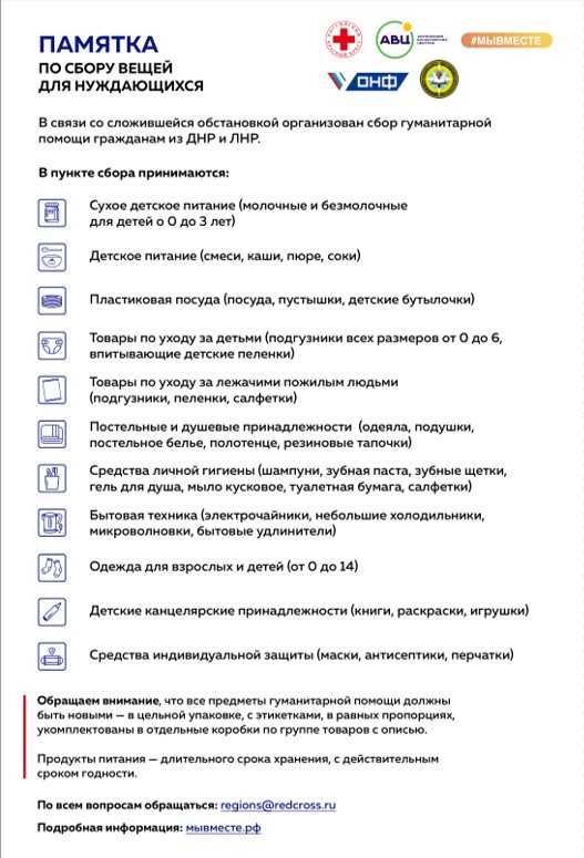 Просим Вас ознакомиться с памятками по сбору гуманитарной помощи для граждан ДНР и ЛРН, вынужденно покинувших свои дома.