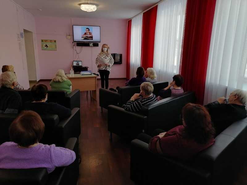 Окунева С.С. познакомила обслуживаемых с представлением великого певца о счастье, перелистав несколько страниц его песенного творчества и книги "Любовь моя - мелодия". Мероприятие также включало в себя видеоматериалы о творчестве певца "Живут во мне воспоминания".
