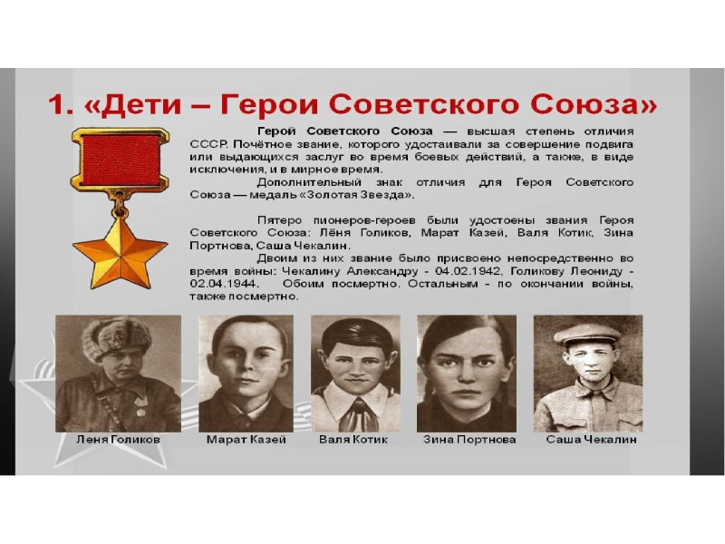 Война… Дети рано стали взрослыми, заменили взрослых на заводе, полях, воевали в действующей армии и партизанских отрядах. Дети сражались, совершали подвиги и были награждены орденами и медалями, удостоены званием «Героя Советского Союза», многие награждены посмертно…