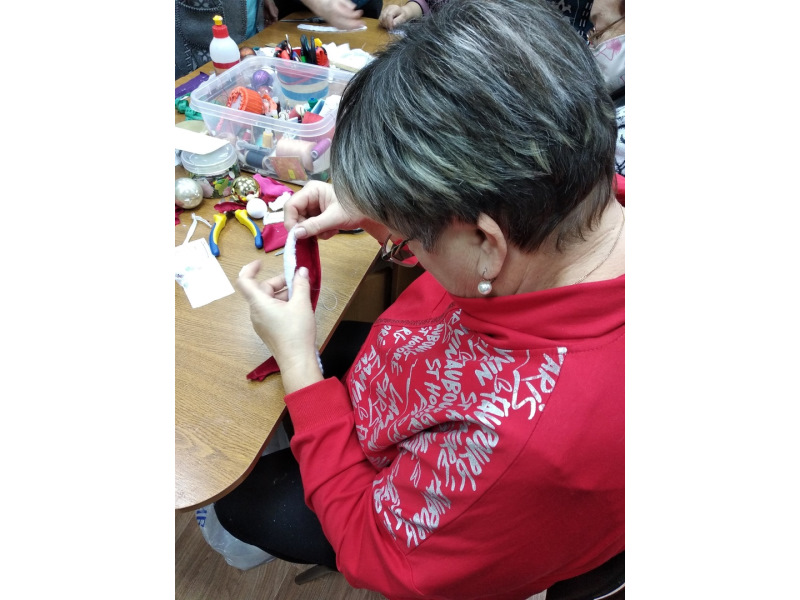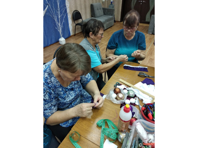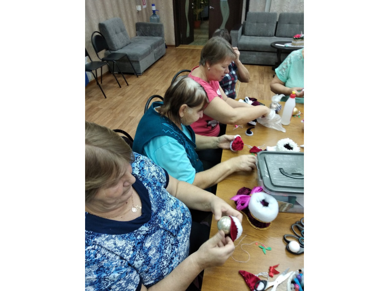 Отдыхающие отделения дневного пребывания на кружке «Волшебный клубочек» изготовили декор для елочных шаров из остатков ткани и тесьмы и бусин