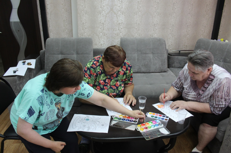 В отделении дневного пребывания для отдыхающих прошло занятие по рисованию. На этот раз раскрашивали акварелью картины раскраски.