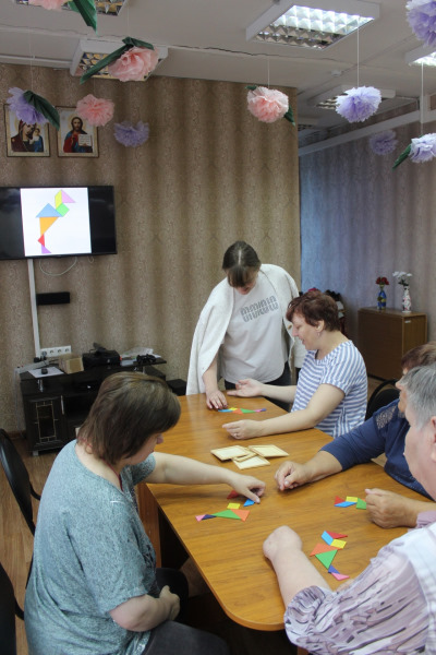 В отделении дневного пребывания для отдыхающих инструктором по трудовой терапии Кузнецовой М.С. было проведено интеллектуальное занятие танграм.