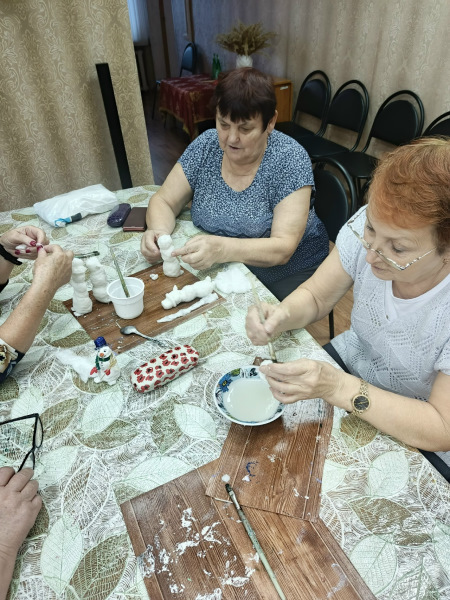 В отделении дневного пребывания отдыхающие изготовили забавного снеговика из простого и дешёвого материала - ваты.