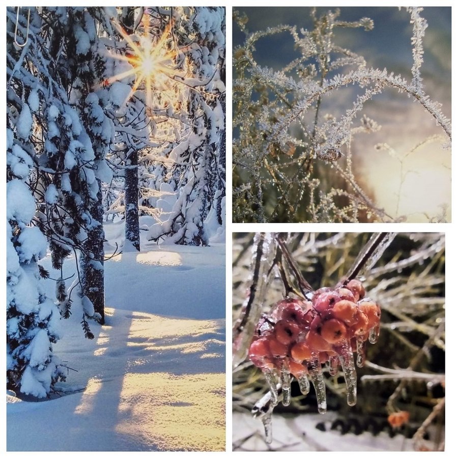 И так, перед нами заснеженные деревья. Дороги, уходящие в чащу леса. Стаи птиц, пригревшихся на крыше домов. Яркие зимние закаты. Искрящийся на солнце снег. Заледеневшие ветви елей и грозди рябины. Детские забавы и зимние виды спорта.